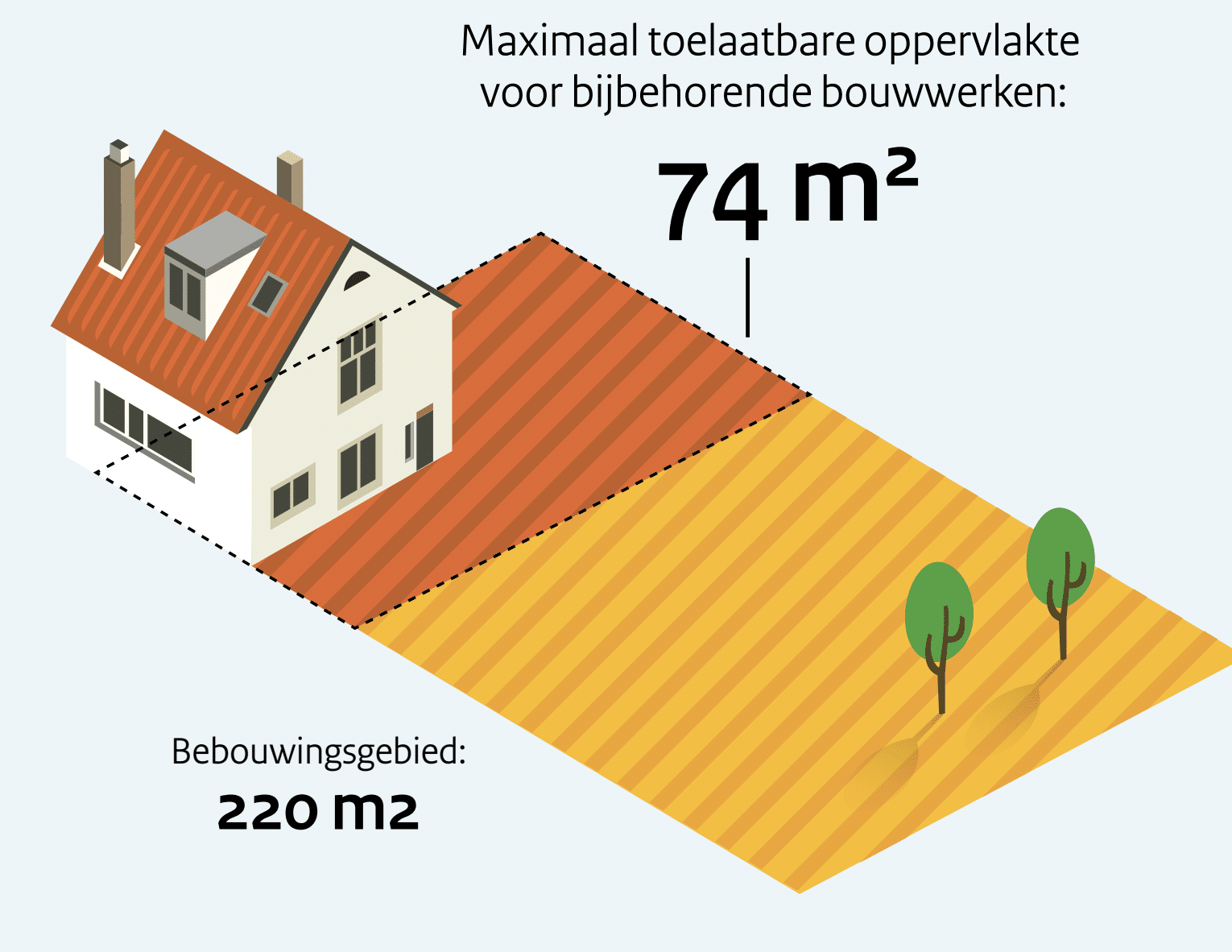 | Groter dan 300 m2 | 90 m2 | 10% van het deel van het bebouwingsgebied dat groter is dan 300 m2, tot een maximum van 150 m2 |